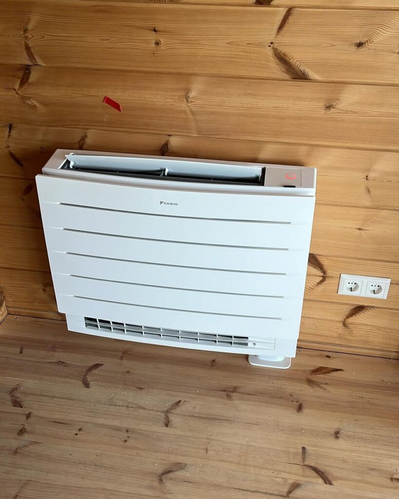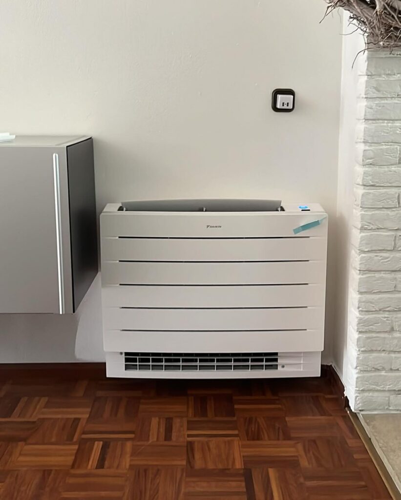 Een vloermodel airco, zoals de Daikin FVXM25A RXM25, lijkt qua plaatsing sterk op een elektrische radiator — hij wordt laag aan de muur gemonteerd, vaak onder een raam of langs een wand.